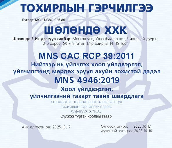 MNS 4946:2019 Хоол үйлдвэрлэл, үйлчилгээний газарт тавих шаардлага-Хүчинтэй